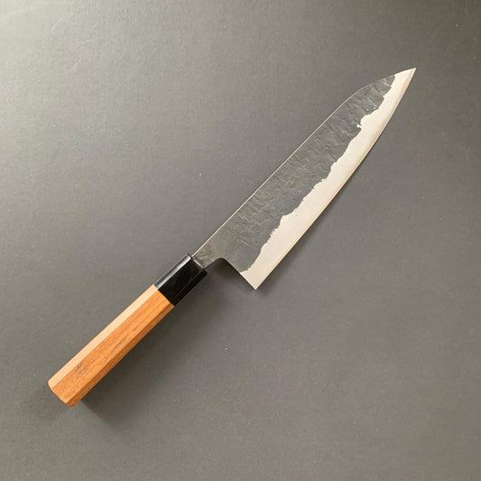 A classic Gyuto shape with aogami steel on the core and clad in stainless steel...