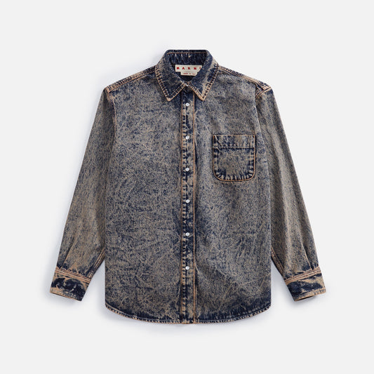 Rigid denim fabric Button placket on front Classic collar Patch pocket on chest Cuffs with...