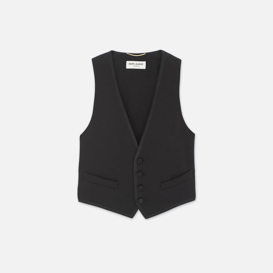 Virgin wool fabric Button closure on front V neckline Welt pockets on front Cut on...