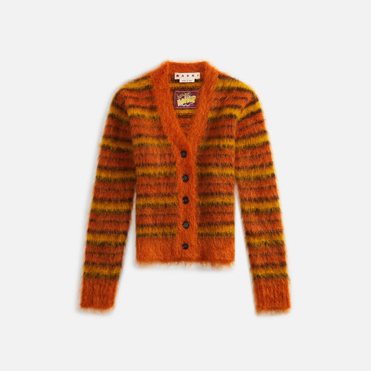 Mohair fabric Ribbed collar, cuffs, and hem All-over horizontal stripes Marni patch on inside collar...