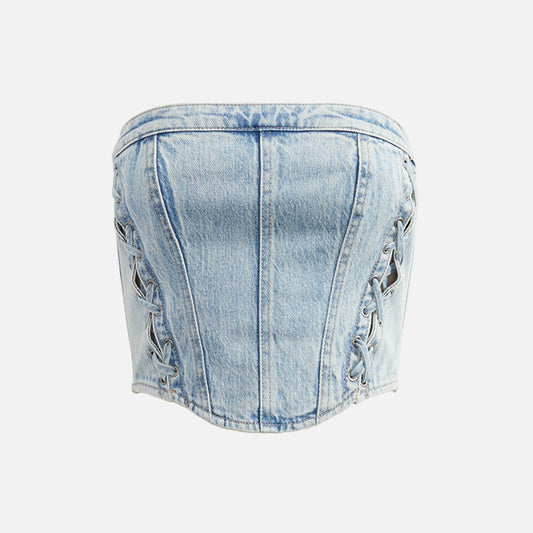 Cotton blend fabric Zipper closure on back Strapless neckline Metal eyelets and denim lace fastening...