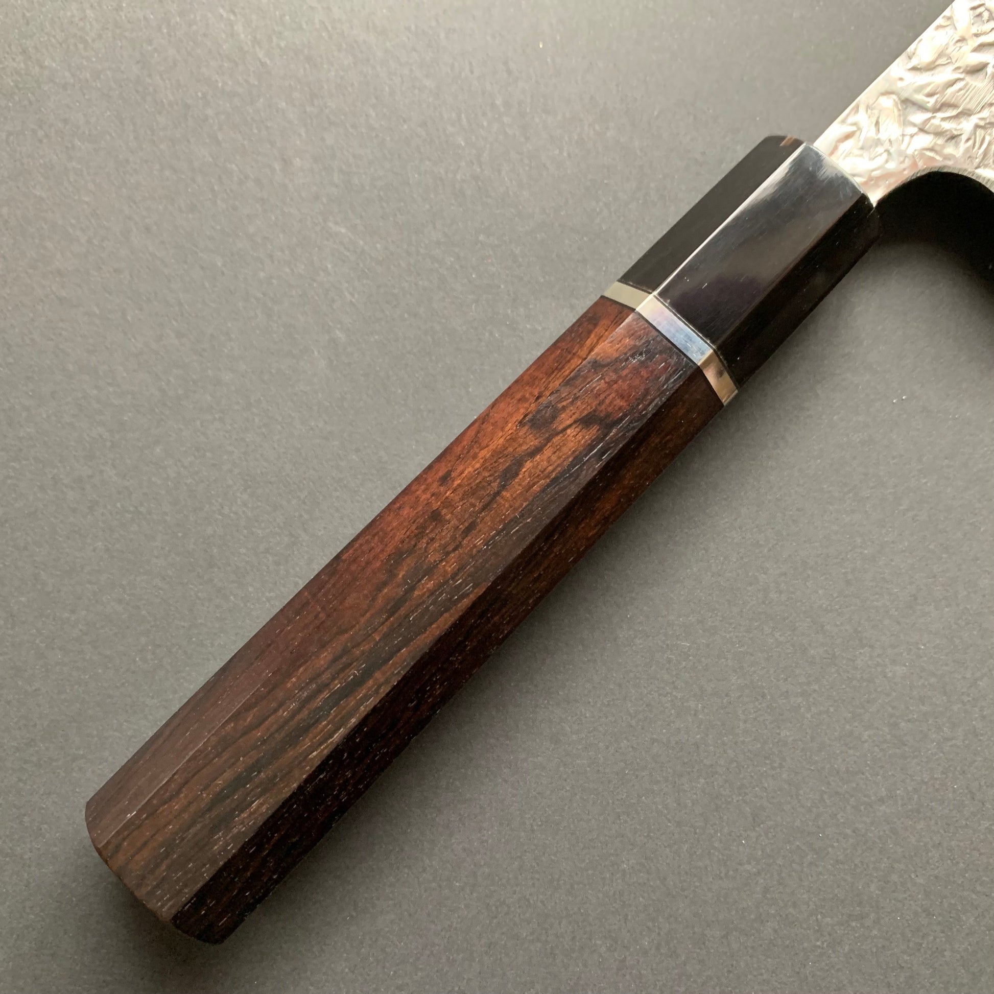 FINISH: Tsuchime. This is a hand hammered finish that is not only beautiful but also functional. The small depressions stop food sticking to the knife. This finishes comes in many different forms from the traditional round hammer marks to more modern patterns.