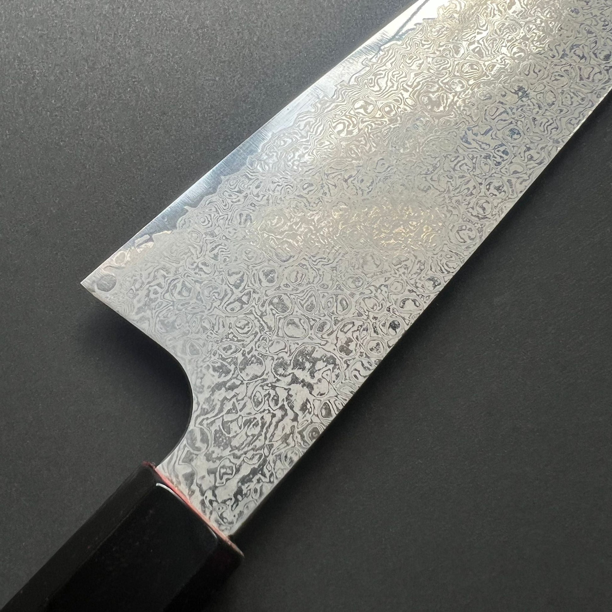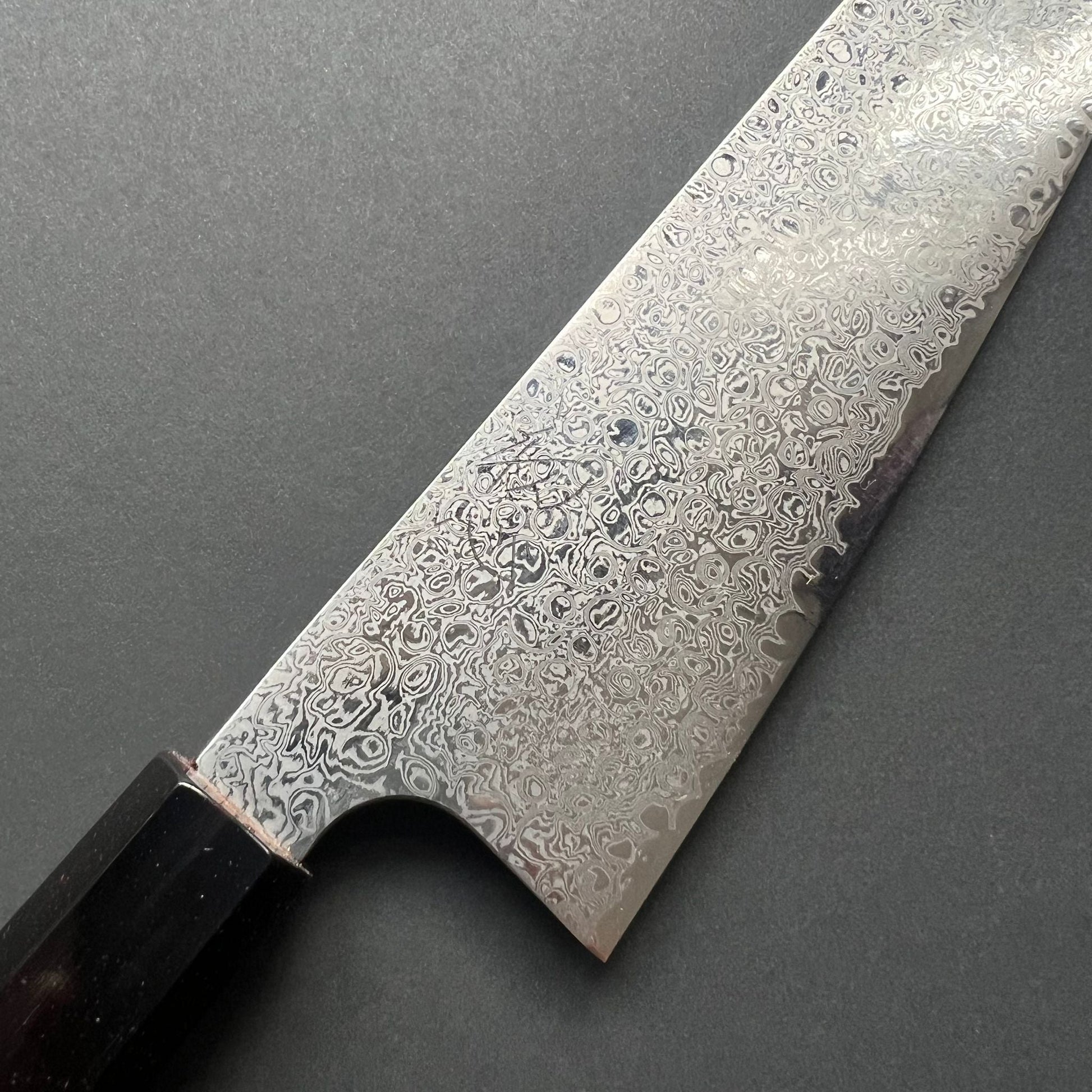 FINISH: Damascus or suminagashi. This type of finish is made by creating a Kitaeji, which is produced by repeatedly folding/stacking then compressing two different steels until they create a laminated pattern. This can then be manipulated in various ways to produce the maker’s desired pattern effect. This material is then clad around the core metal of the blade as an elaborate protective layer for the core steel - thus giving the knife a beautiful and striking appearance