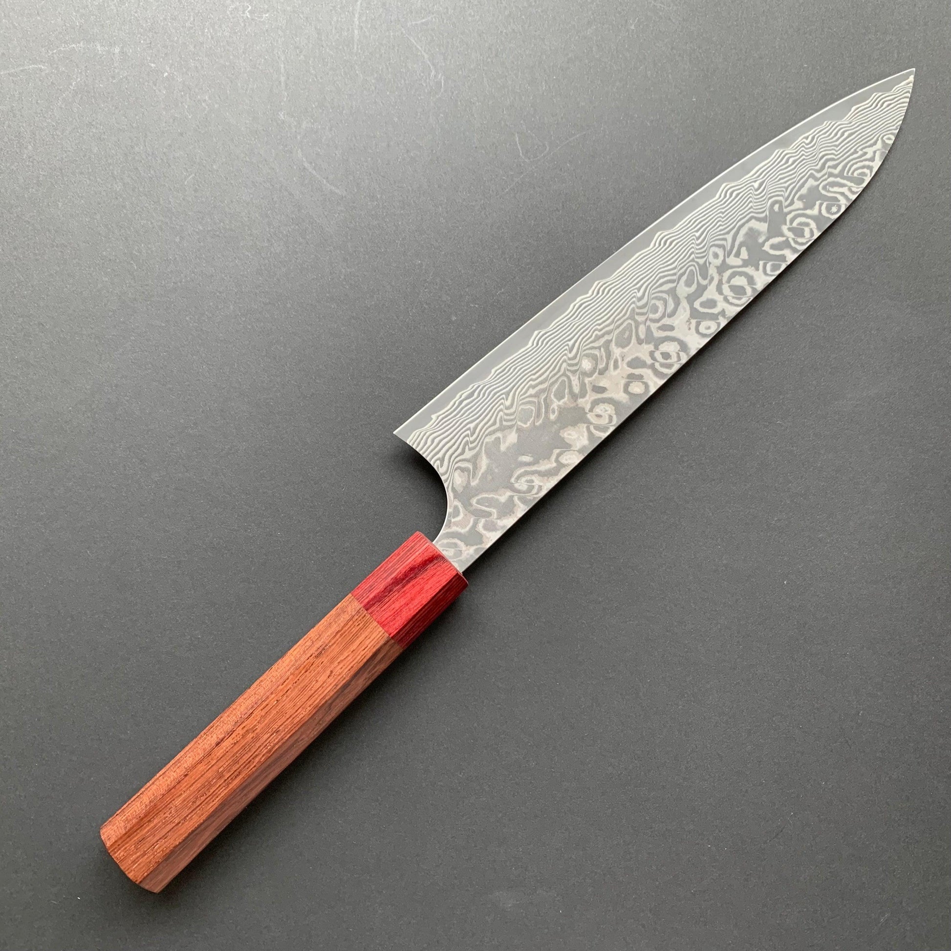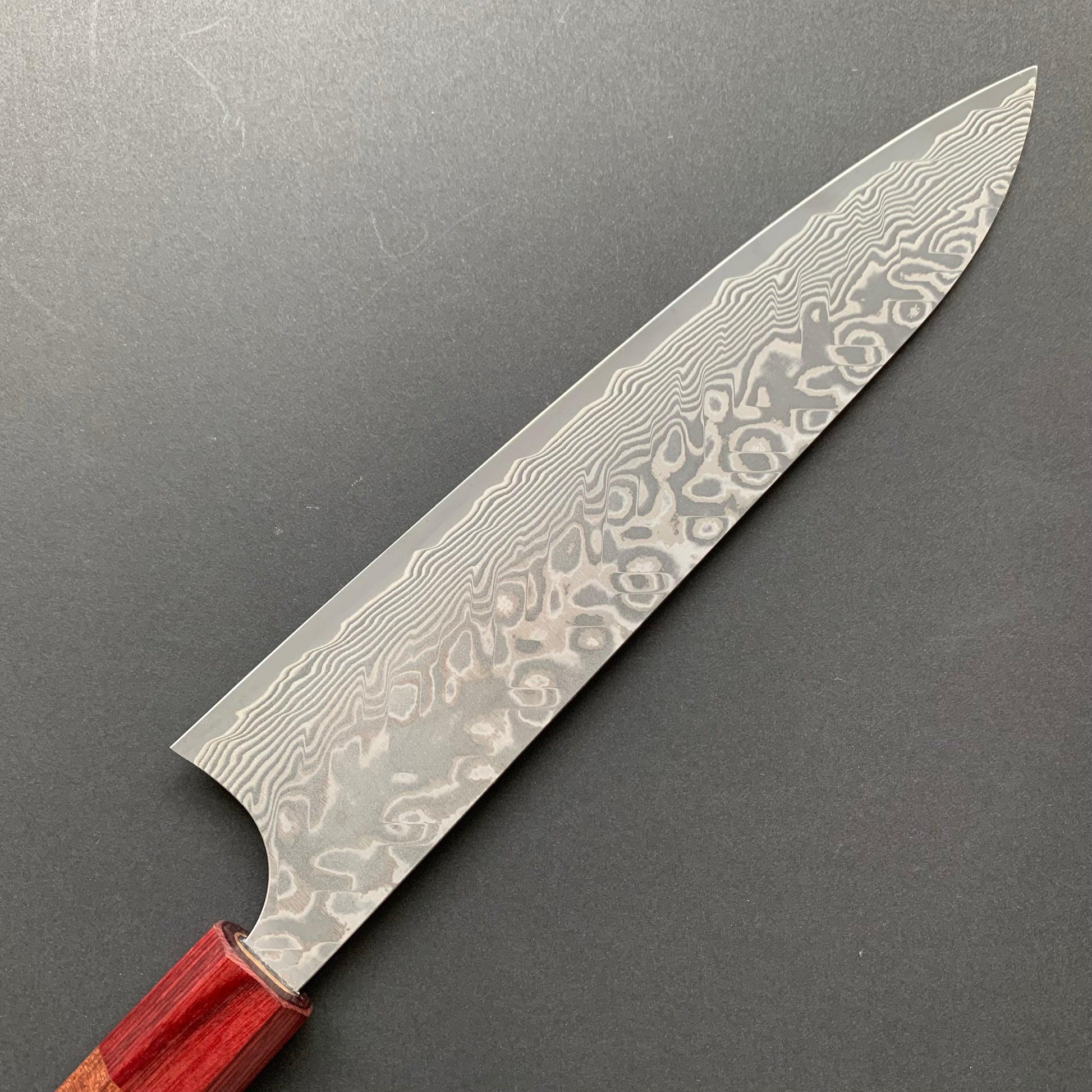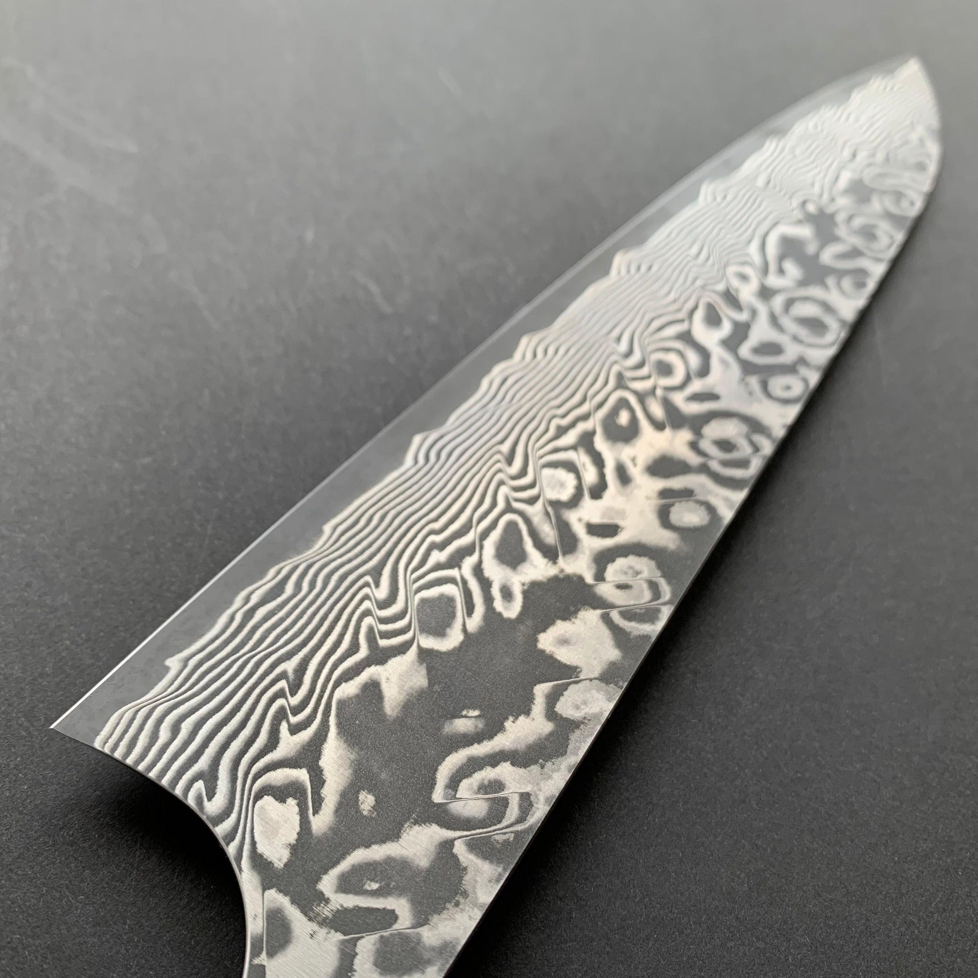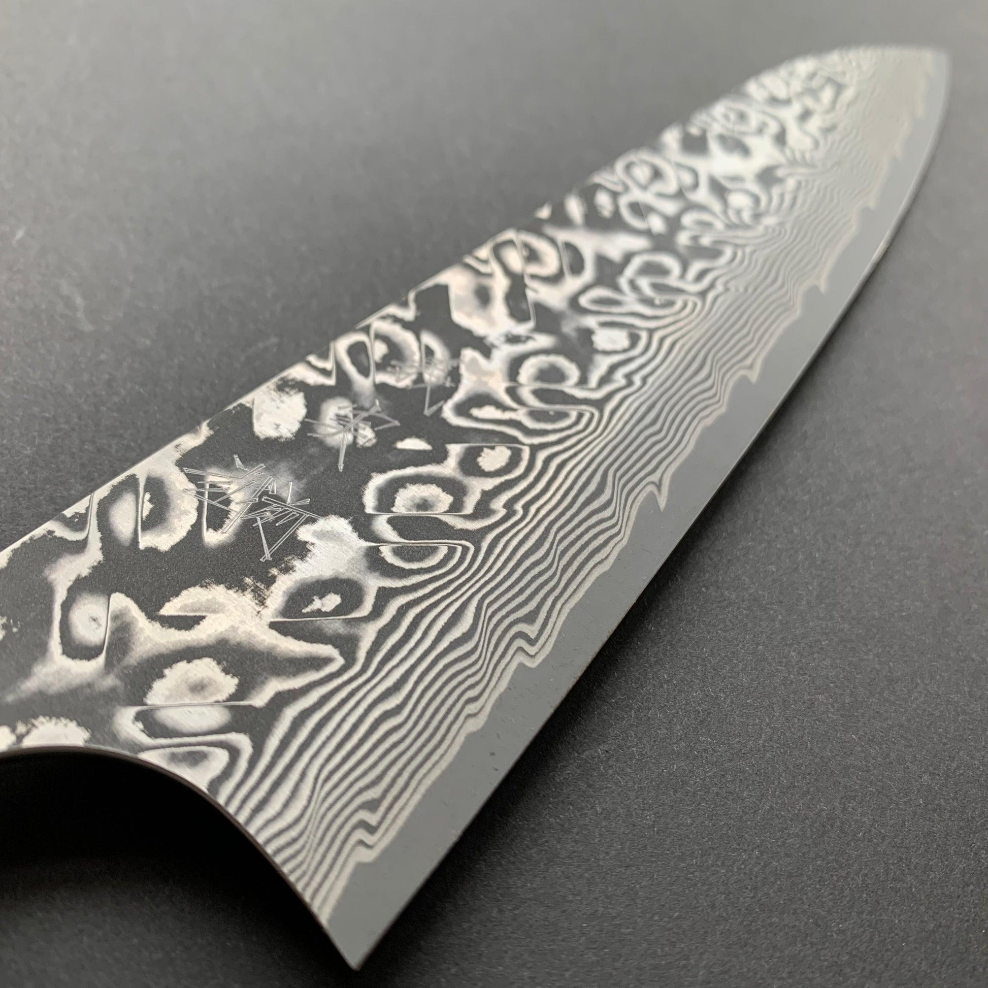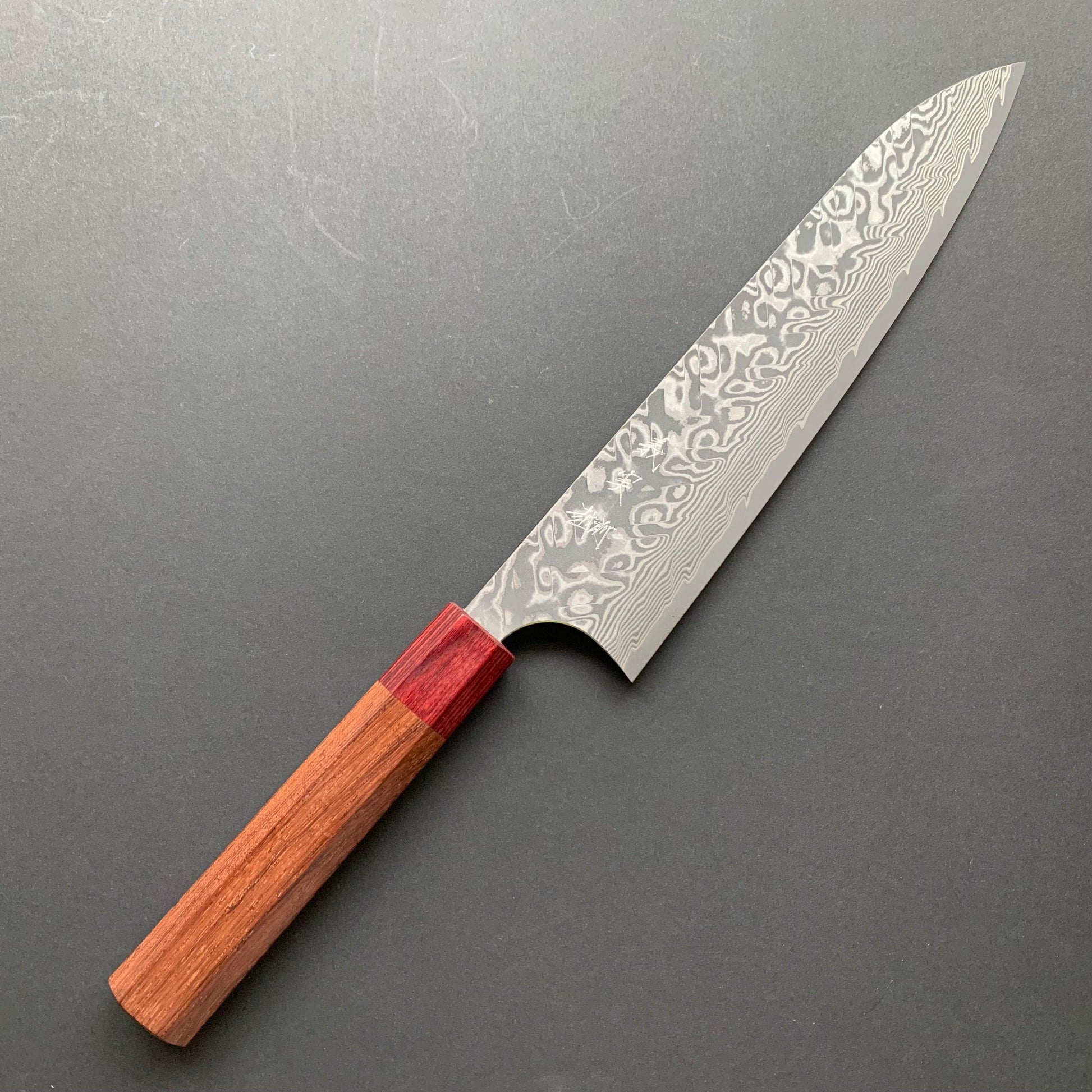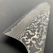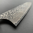 FINISH: Damascus or Suminagashi. This type of finish is made by creating a Kitaeji; which is produced by repeatedly folding/stacking then compressing two different steels until they create a laminated pattern. This can then be manipulated in various ways to produce the maker’s desired pattern effect. This material is then clad around the core metal of the blade as an elaborate protective layer for the core steel - thus giving the knife a beautiful and striking appearance.