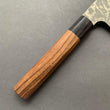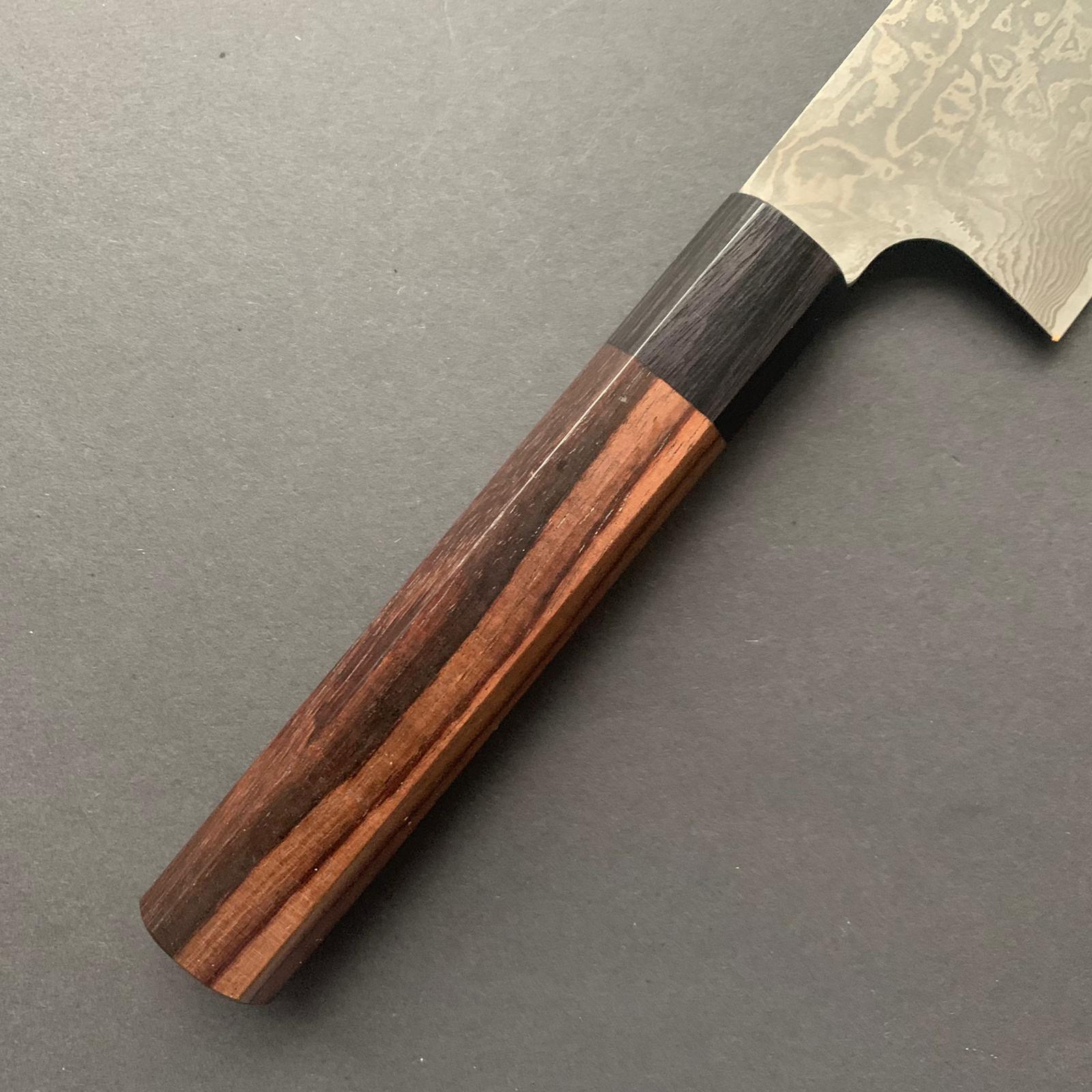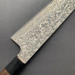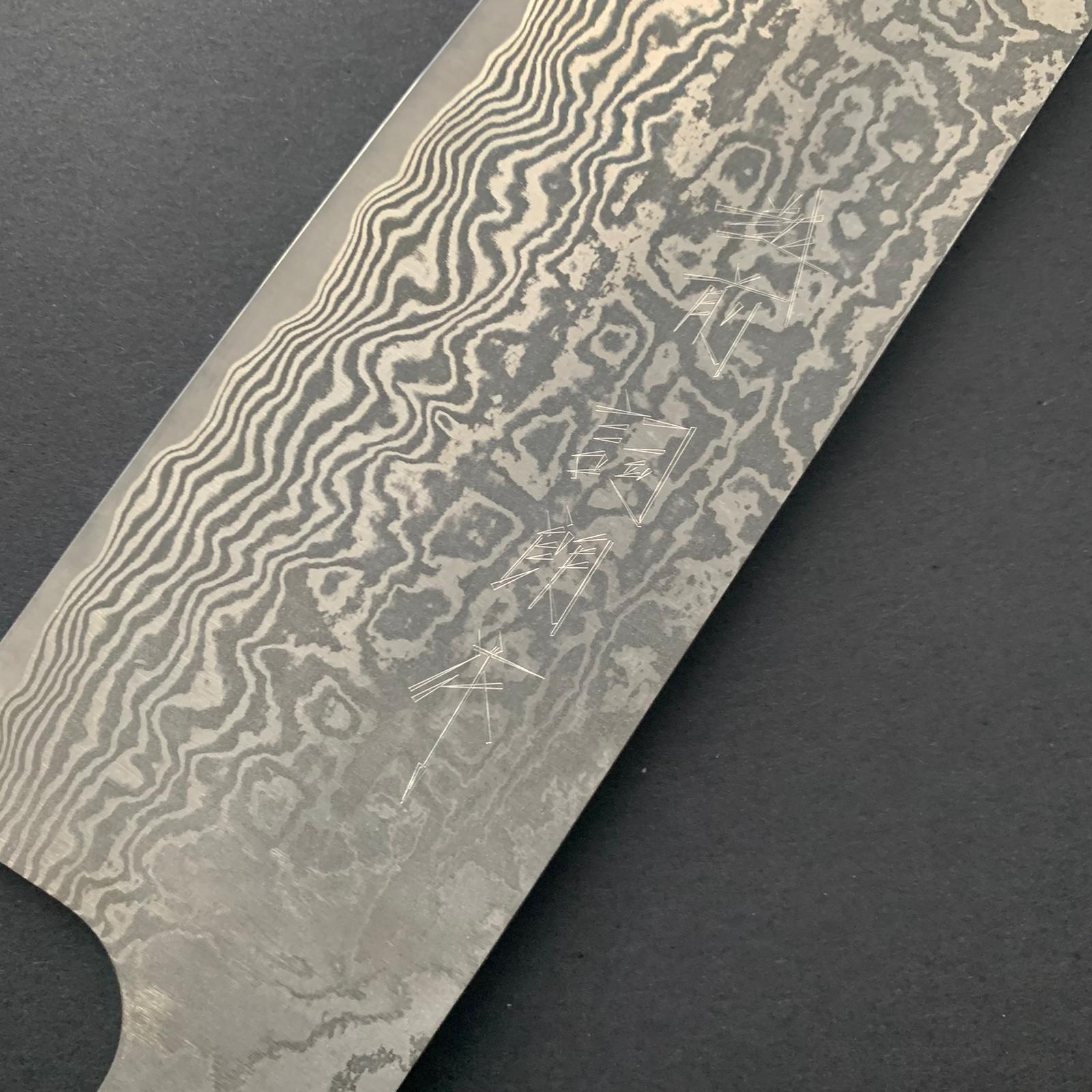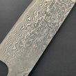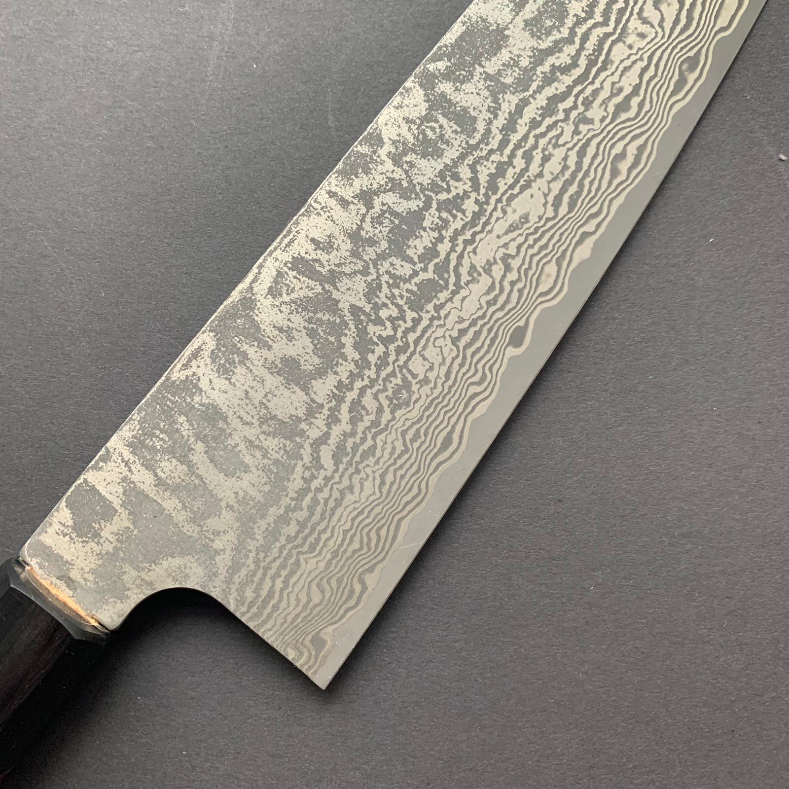 FINISH: Damascus or Suminagashi. This type of finish is made by creating a Kitaeji; which is produced by repeatedly folding/stacking then compressing two different steels until they create a laminated pattern. This can then be manipulated in various ways to produce the maker’s desired pattern effect. This material is then clad around the core metal of the blade as an elaborate protective layer for the core steel - thus giving the knife a beautiful and striking appearance.