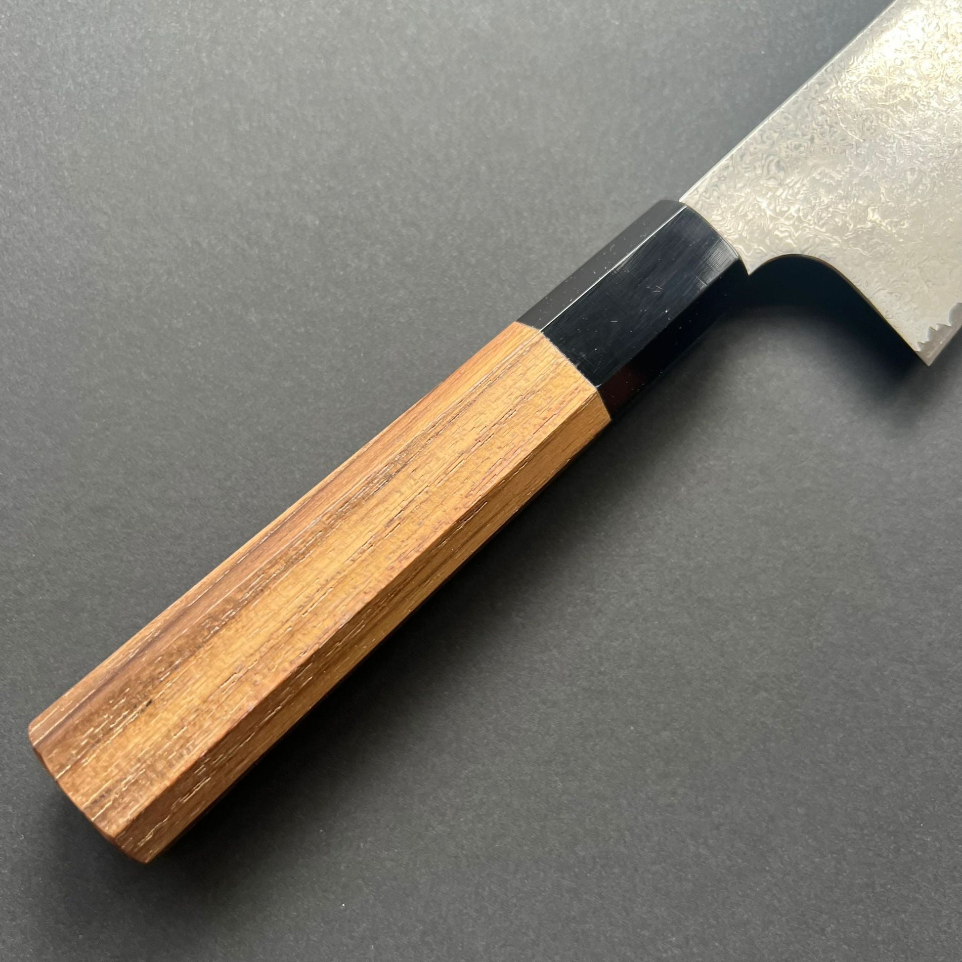 FINISH: Damascus or suminagashi. This type of finish is made by creating a Kitaeji, which is produced by repeatedly folding/stacking then compressing two different steels until they create a laminated pattern. This can then be manipulated in various ways to produce the maker’s desired pattern effect. This material is then clad around the core metal of the blade as an elaborate protective layer for the core steel - thus giving the knife a beautiful and striking appearance