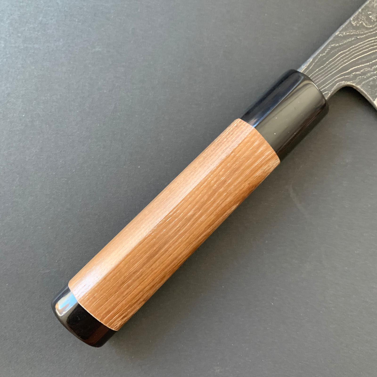 FINISH: Damascus or suminagashi. This type of finish is made by creating a Kitaeji; which is produced by repeatedly folding/stacking then compressing two different steels until they create a laminated pattern. This can then be manipulated in various ways to produce the maker’s desired pattern effect. This material is then clad around the core metal of the blade as an elaborate protective layer for the core steel, thus giving the knife a beautiful and striking appearance. In the case of this knife, the Damascus cladding has both copper and brass in it giving it the beautiful colour.