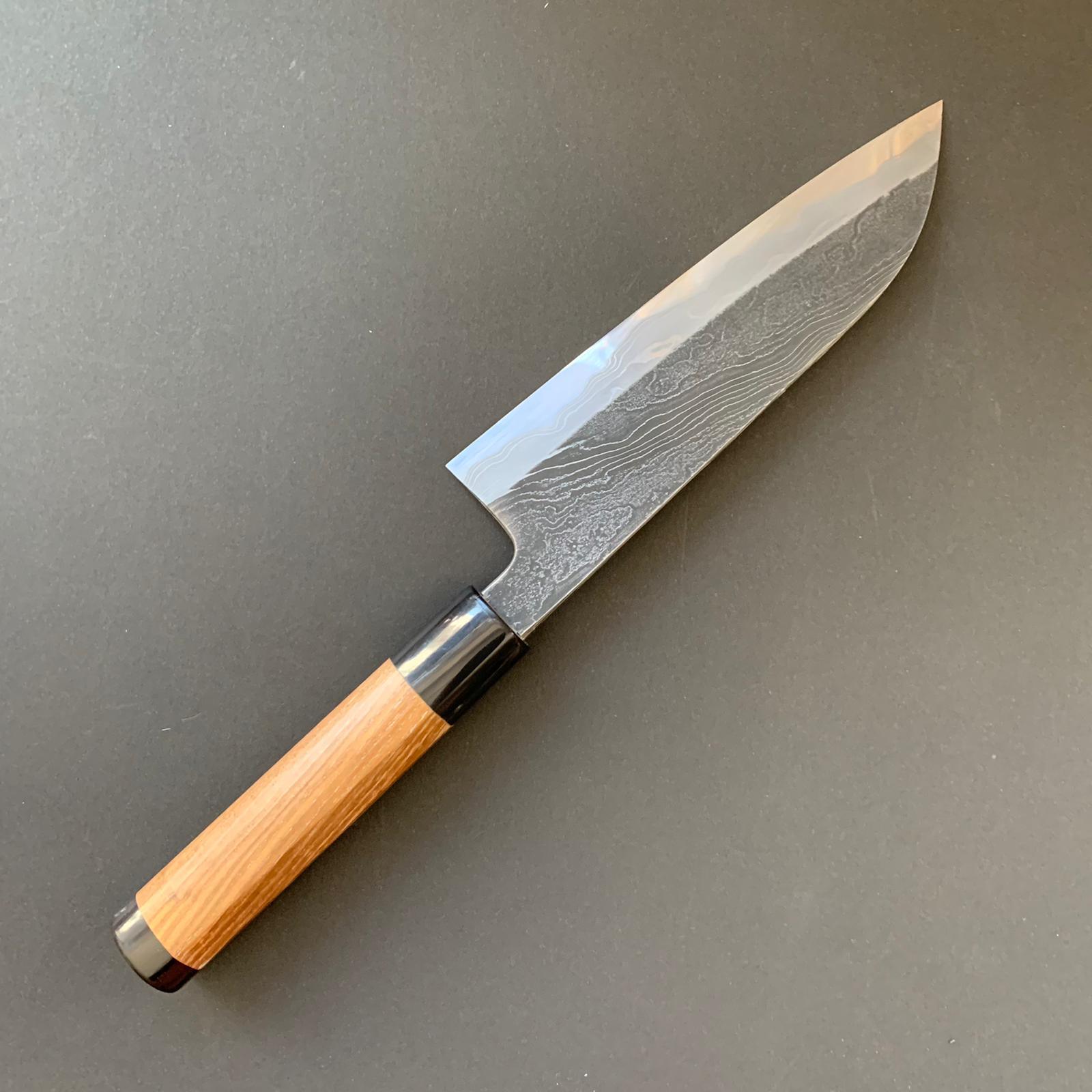 STEEL: Shirogami (white) 2 steel. It is a reactive carbon steel which is easy to sharpen and holds an edge well. This steel is often chosen for traditional-style Japanese knives. Care must be taken to keep these knives dry as they will rust easily.