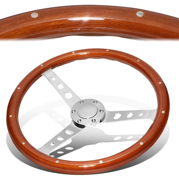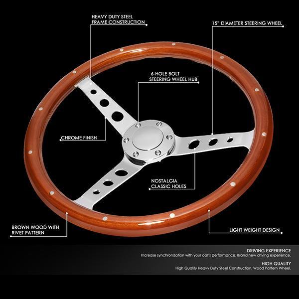 15 in. Vintage Style Riveted Wood Grain Steering Wheel - Stainless Steel Spokes